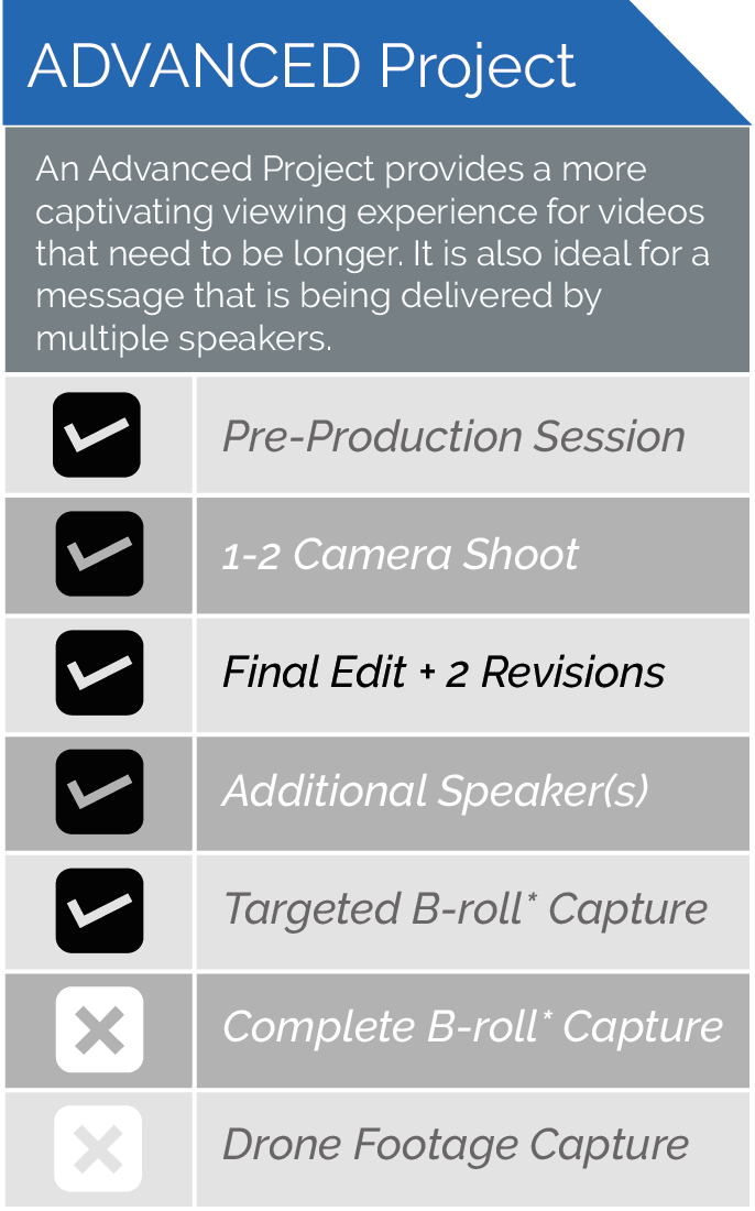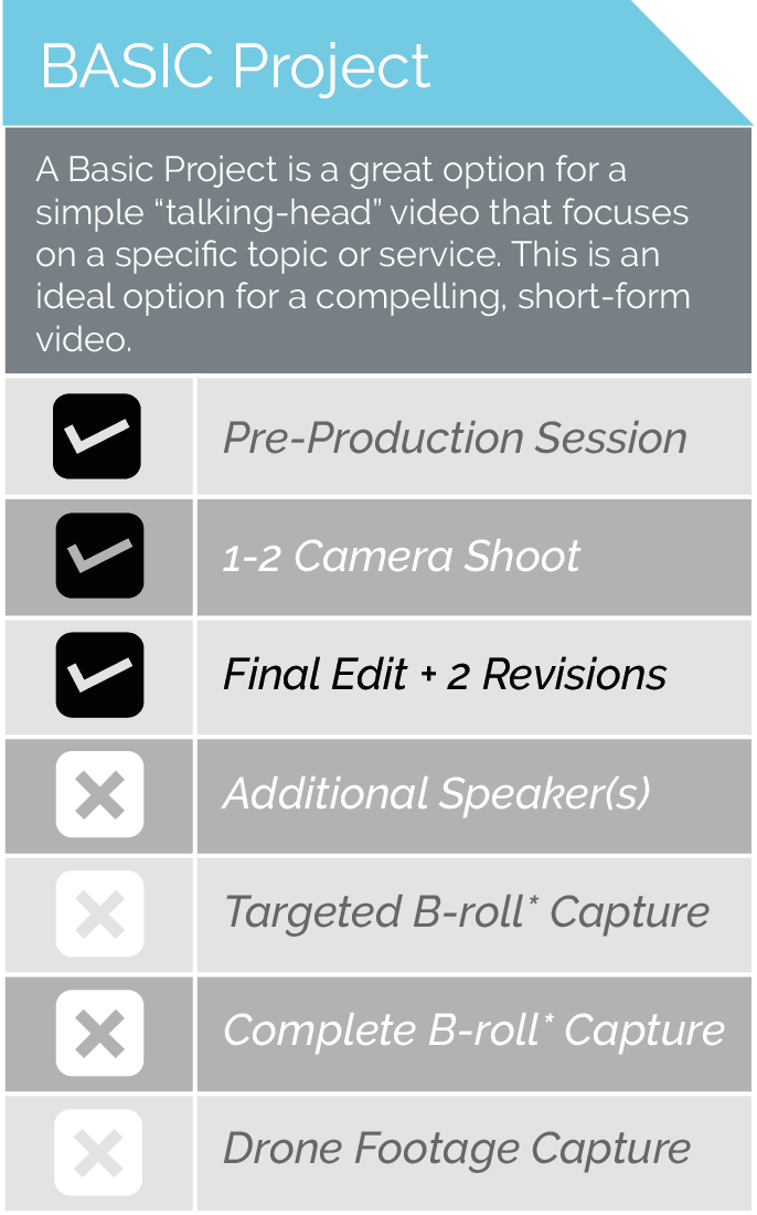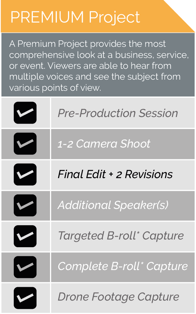 Each Greatlight Creative Video Project Package includes a collaborative pre-production session to craft a compelling message, a comfortable, professional video shoot to capture the message, and a professionally edited final video to present the message.